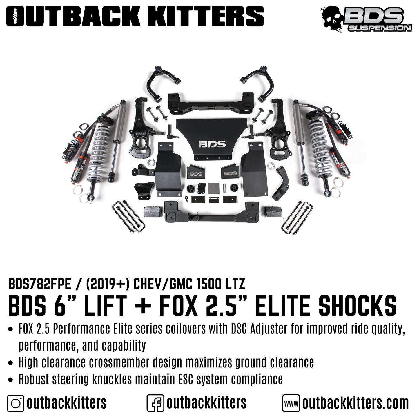 Up the ante in performance with your Chevy Silverado and GMC Sierra 1500 truck by installing the BDS 6-inch lift kit suspension featuring FOX 2.5 Performance Elite coil-over shocks. Designed to improve stance, performance, and capability, this kit includes everything necessary to set your truck up right with clearance for up to 35" tires. These kits feature proprietary FOX 2.5 coil-over shocks designed specifically to bolt-on performance for increase travel and the ability to soak up the roughest terrain along with smooth on-road comfort.